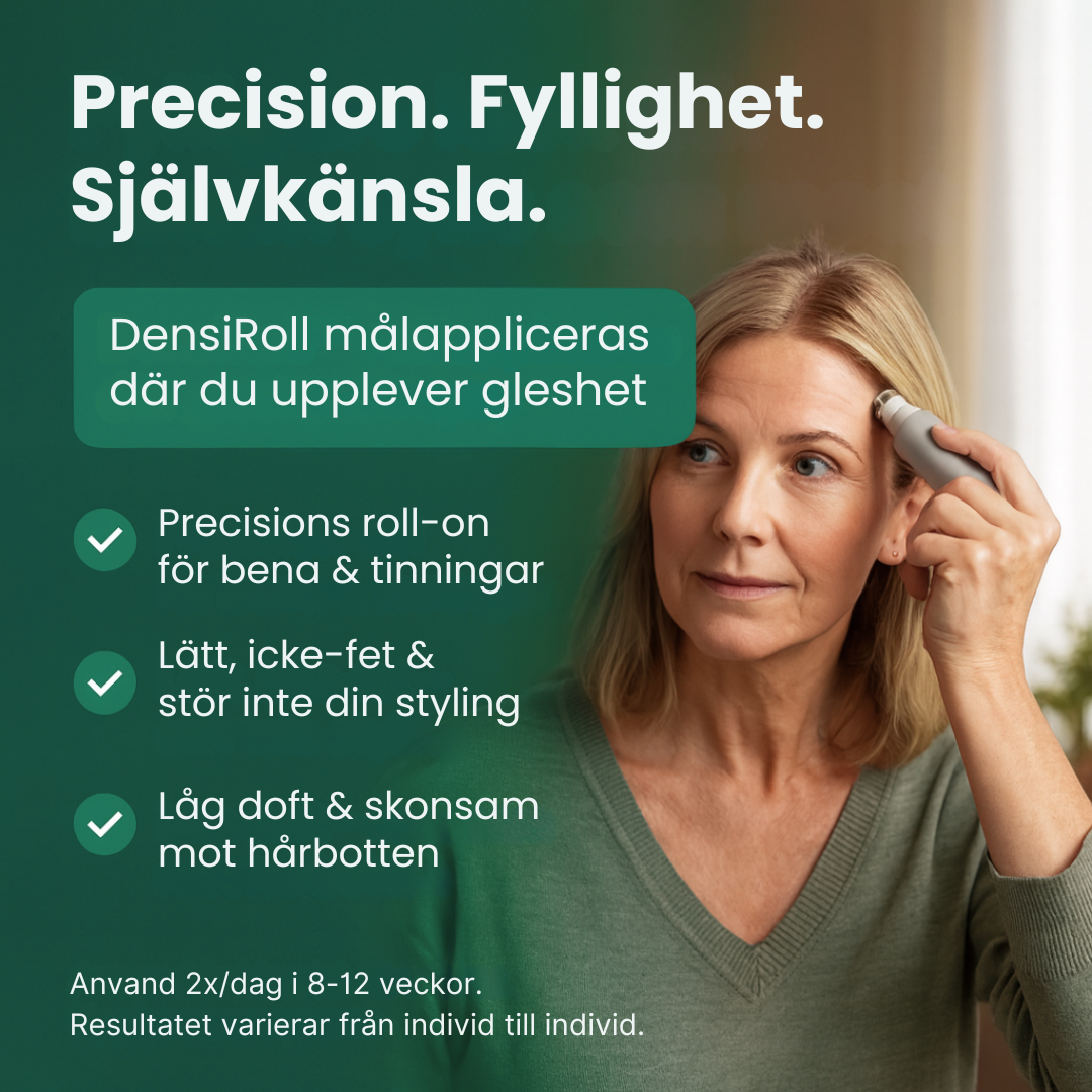 Med DensiRoll™ målappliceras den lätta roll-on-formulan där glesheten syns – så håret kan upplevas tätare och starkare över tid.